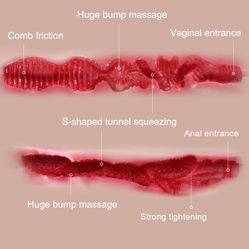 This silicone doll has two impressive access to stimulate your penis just like the real deal. It has a lot of suction because it has no exit holes. The vaginal tube is tight and textured and the anus is smooth and comfortable. Both circle entrances are tight offering enough length and different feeling.